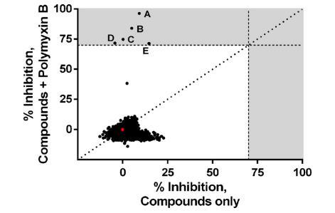 圖1.從2686種化合物庫中,5種化合物顯示出與500μg/mL多粘菌素B(PMB)對洋蔥伯克霍爾德菌K56-2的協(xié)同效應(yīng)。結(jié)果以化合物存在下的生長抑制百分比表示,相對于無化合物時(shí)(無論是單獨(dú)使用,x軸)或與PMB組合使用(y軸)。黑點(diǎn)代表每種化合物。紅點(diǎn)代表所有未添加庫化合物的孔的結(jié)果(每板一孔)。被認(rèn)為單獨(dú)顯著抑制或與PMB協(xié)同的化合物必須抑制生長≥70%(虛線表示,陰影區(qū)域代表更高抑制水平)。點(diǎn)線斜率為1并通過原點(diǎn);僅用于說明目的。左上象限的點(diǎn)代表在測試濃度下不直接抑制洋蔥伯克霍爾德菌生長但與PMB協(xié)同的化合物。右下象限的點(diǎn)代表抑制洋蔥伯克霍爾德菌但被PMB拮抗的化合物。右上象限靠近線的點(diǎn)代表抑制洋蔥伯克霍爾德菌但不增加或減少PMB效應(yīng)的化合物?;衔餅椋ˋ)IKD-8344、(B)新生霉素、(C)CL0231、(D)micacocidin B和(E)thielavin B。