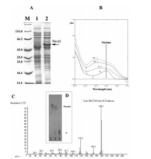 為了驗(yàn)證該新型基因的預(yù)測(cè),從S16菌株克隆了nicA2并在大腸桿菌BL21(DE3)細(xì)胞中表達(dá)(文本S1)。IPTG誘導(dǎo)后,在大腸桿菌裂解物中發(fā)現(xiàn)了大約50 kDa的大量蛋白質(zhì),而在未誘導(dǎo)細(xì)胞或僅含有載體的細(xì)胞中觀察不到這樣的條帶(圖6A)。含有pET28a-nicA2質(zhì)粒的靜息細(xì)胞用于轉(zhuǎn)化尼古丁,并且它們可以降解尼古丁,如UV掃描分析所示;因此證實(shí)nicA2基因產(chǎn)物具有預(yù)期的功能(圖6B)。通過(guò)TLC和GC-MS分析鑒定了中間體N-甲基米斯明(P),并且我們觀察到與先前報(bào)道相同的結(jié)果(圖6C和圖6D)[11]。
