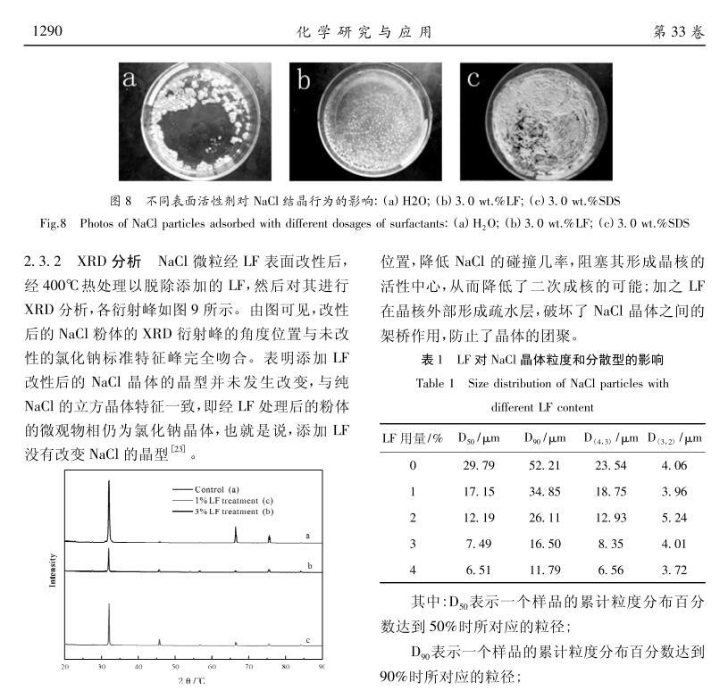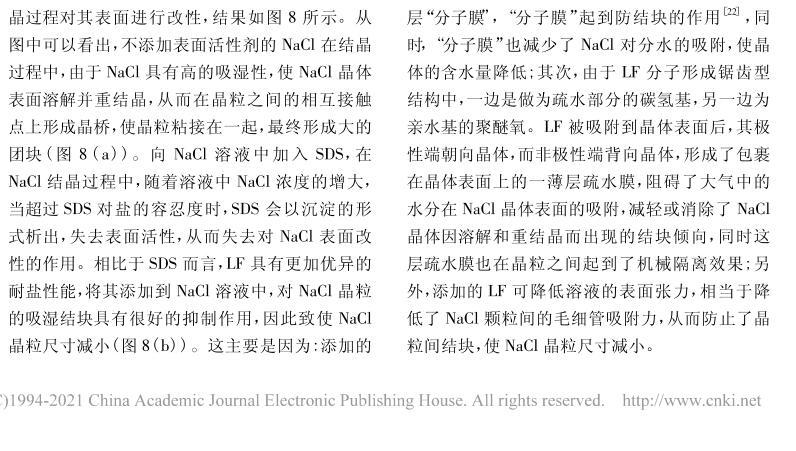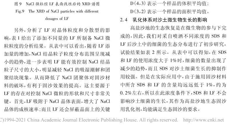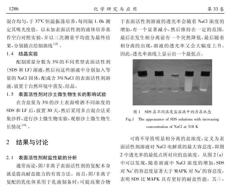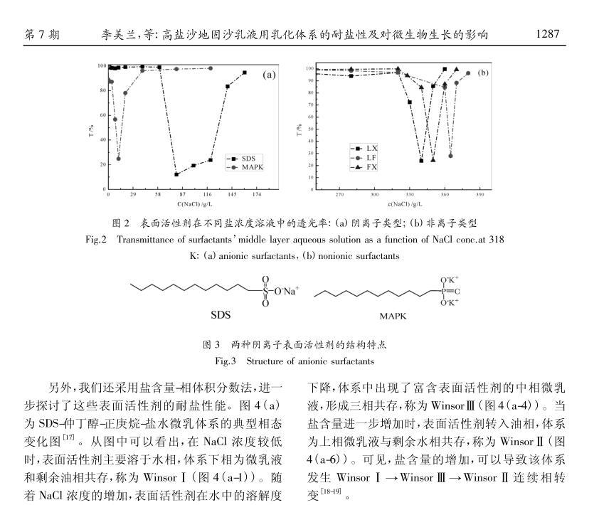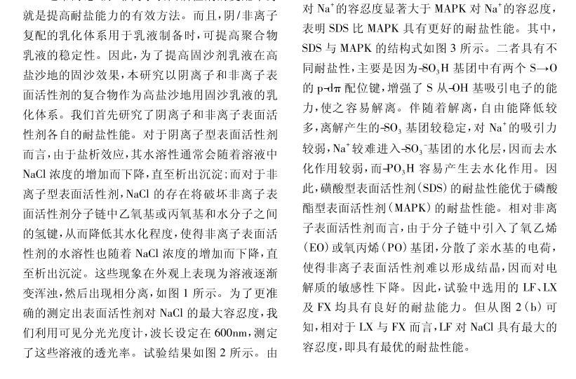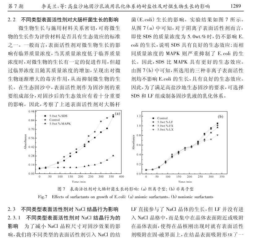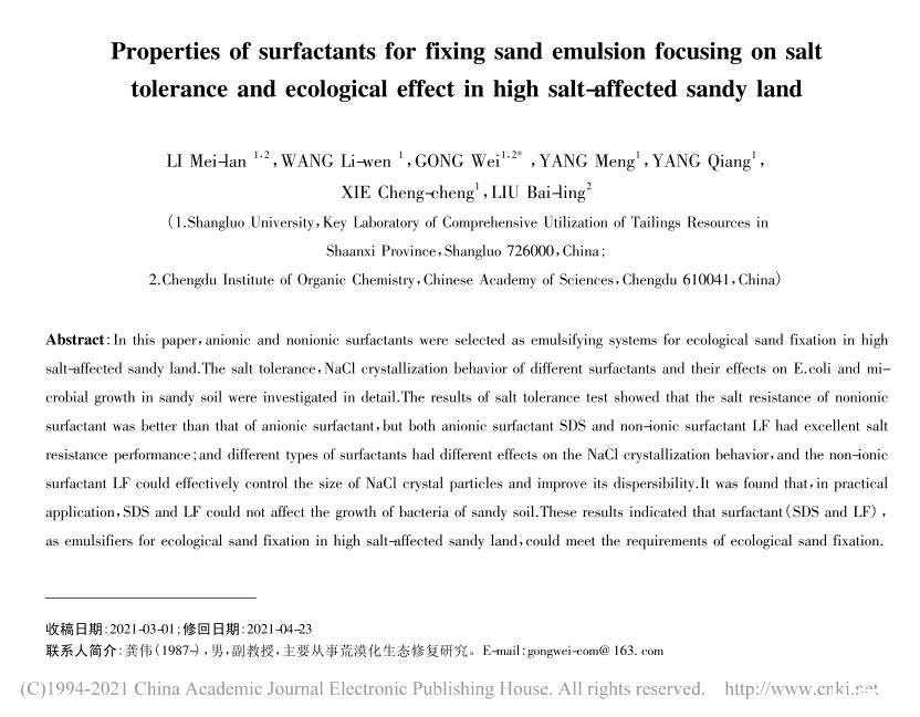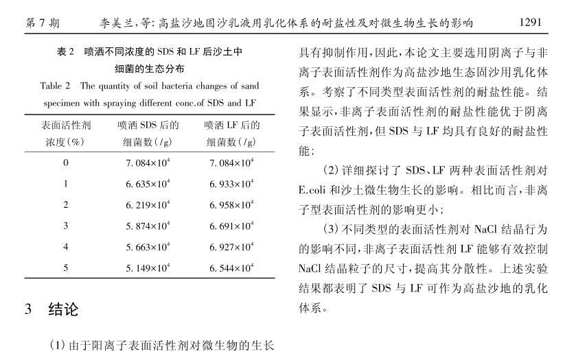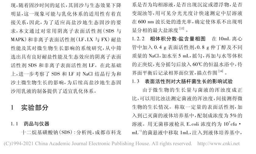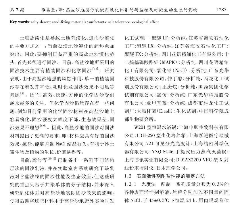 【摘要】:本論文主要選用陰離子與非離子表面活性劑作為高鹽沙地生態(tài)固沙用乳化體系,詳細(xì)地考察了不同類型表面活性劑的耐鹽性能、對NaCl結(jié)晶行為,以及它們對E.coli和沙土微生物生長的影響。耐鹽性實驗結(jié)果顯示,非離子表面活性劑的耐鹽性能優(yōu)于陰離子表面活性劑,但陰離子表面活性劑SDS與非離子表面活性劑LF均具有良好的耐鹽性能;且不同類型的表面活性劑對NaCl結(jié)晶行為的影響不同,非離子表面活性劑LF能夠有效控制NaCl結(jié)晶粒子的尺寸,提高其分散性。微生物實驗發(fā)現(xiàn),在實際應(yīng)用中,SDS和LF不會影響沙土細(xì)菌的生長,其作為高鹽沙地生態(tài)固沙用乳化劑,均能滿足生態(tài)固沙的要求。