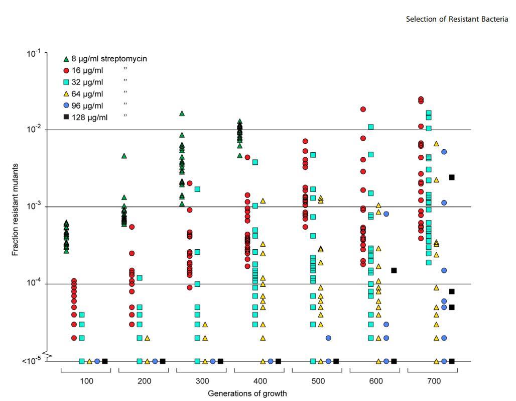 圖5。選擇抗生素亞抑制濃度下的新發(fā)耐藥突變體。共有20個獨立的鼠傷寒沙門氏菌譜系在含有1mg/ml鏈霉素的Mueller-Hinton培養(yǎng)基中連續(xù)傳代。每100代約有105個細胞被接種到含有不同濃度鏈霉素的LB瓊脂上,并計算耐藥突變體的比例。數(shù)據(jù)點按生長世代數(shù)和耐藥水平分組,在每個數(shù)據(jù)集中,一個數(shù)據(jù)點代表一個譜系中能夠在指定抗生素濃度下生長的細胞比例。請注意,基線處的數(shù)據(jù)點將重疊。doi:10.1371/期刊。ppat。1002158.g005
