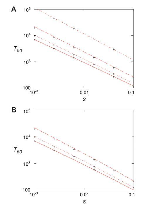 圖6。適應性突變的固定時間。(A)當N=107且從上到下,u=1029、1028、1027和1026最初不存在突變體時,50%的穿透時間作為選擇系數(shù)的函數(shù)。紅線來自公式(4)和隨機模型的交叉點,即公式(Eqs)。(7)–(10),m0=0。(B)。當突變體的初始存在由突變選擇平衡決定時,50%的穿透時間作為選擇系數(shù)的函數(shù),m0=Nf0=uN/|s0|。結(jié)果是s0=20.02,N=107,從上到下,u=102610271028。紅線來自公式(6),交叉點來自隨機模型Eqs。(7)–(10).doi:10.1371/期刊。ppat。1002158.g006