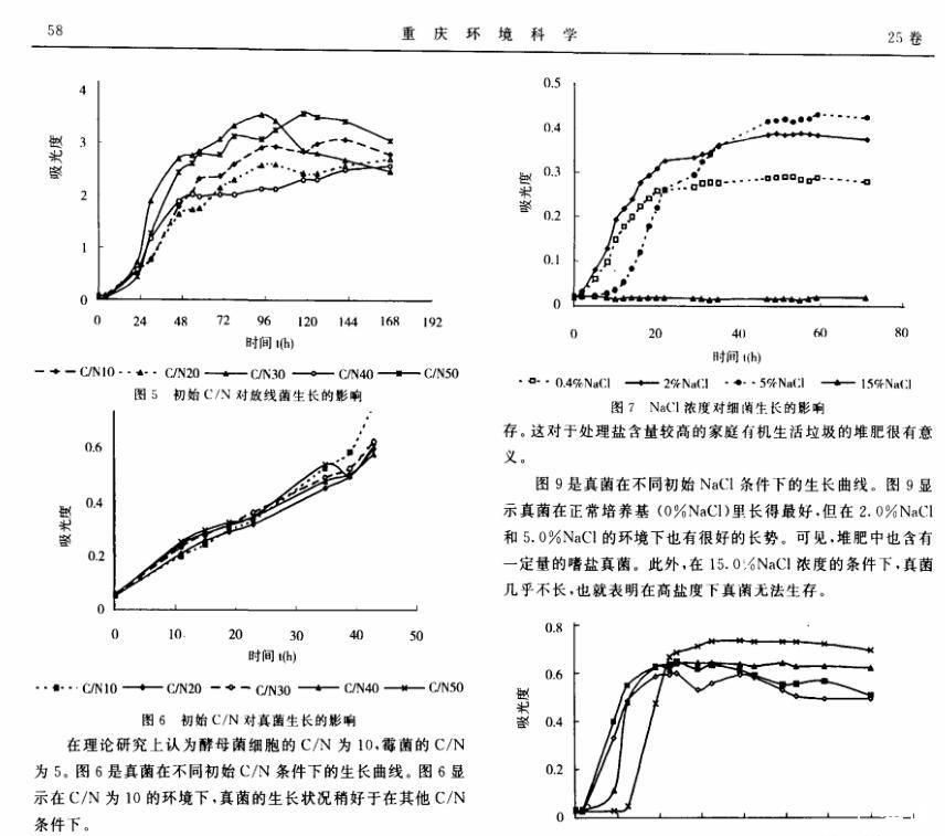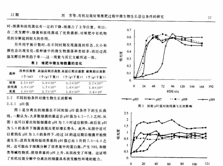 【摘要】:研究了堆肥過(guò)程中微生物種群和數(shù)量的變化以及堆肥中各種中溫微生物的最優(yōu)生長(zhǎng)條件。真菌在高溫期是優(yōu)勢(shì)菌群,細(xì)菌在腐熟期是優(yōu)勢(shì)菌群,且經(jīng)過(guò)堆肥發(fā)酵后,微生物的種群趨于單一;中溫細(xì)菌、放線菌、真菌分別在p H為7,8,5的環(huán)境下,在C/N為50,30,1 0的環(huán)境下,在2%~5%的Na Cl濃度下生長(zhǎng)最好;且中溫細(xì)菌能改變酸性環(huán)境,使之適應(yīng)細(xì)菌的生長(zhǎng)。中溫真菌具有較強(qiáng)的耐酸堿性。中溫放線菌具有很強(qiáng)的耐鹽性,可在含1 5%的Na Cl溶液中生長(zhǎng)。