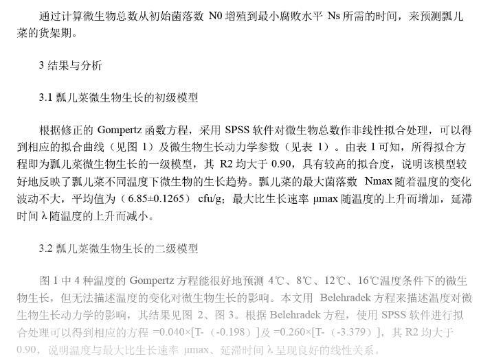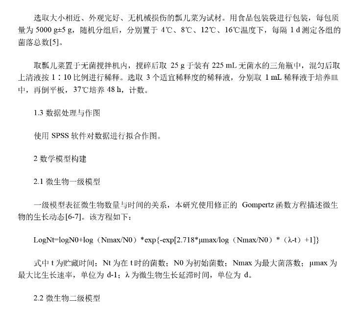 【摘要】:以采后瓢兒菜為試驗(yàn)對(duì)象,研究了不同貯藏溫度下瓢兒菜的微生物生長(zhǎng)趨勢(shì),建立了瓢兒菜微生物生長(zhǎng)動(dòng)力學(xué)模型和微生物貨架期預(yù)測(cè)模型。結(jié)果表明:修正的Gompertz方程能夠較好地?cái)M合不同溫度下瓢兒菜微生物生長(zhǎng)的初級(jí)模型,其R~2均大于0.90;瓢兒菜的最大菌數(shù)Nmax隨溫度的變化波動(dòng)不大,平均值為(6.85±0.1265)cfu/g;最大比生長(zhǎng)速率μmax隨溫度的上升而增加,生長(zhǎng)延滯時(shí)間λ隨溫度的上升而減??;二級(jí)模型為=0.040×[T-(-0.198)]及=0.260×[T-(-3.379)],其R2均大于0.90。通過(guò)初級(jí)模型和二級(jí)模型確立了瓢兒菜的微生物貨架期預(yù)測(cè)模型。