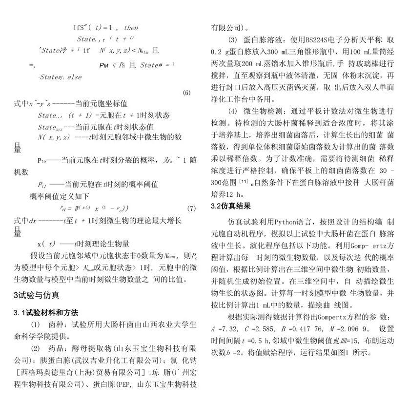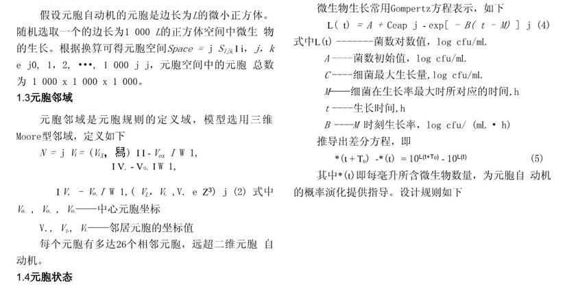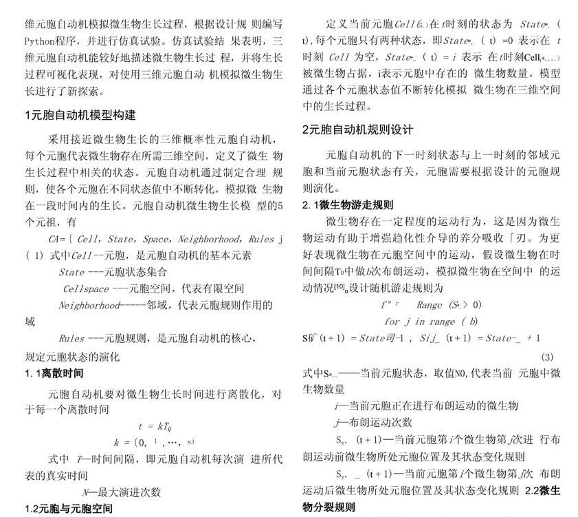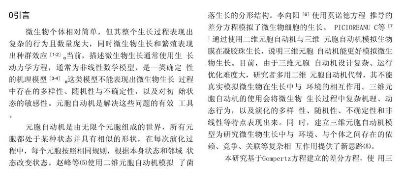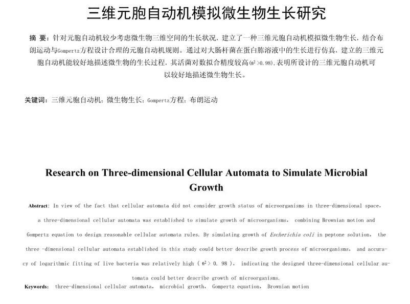 【摘要】:針對元胞自動(dòng)機(jī)較少考慮微生物三維空間的生長狀況,建立了一種三維元胞自動(dòng)機(jī)模擬微生物生長,結(jié)合布朗運(yùn)動(dòng)與Gompertz方程設(shè)計(jì)合理的元胞自動(dòng)機(jī)規(guī)則。通過對大腸桿菌在蛋白胨溶液中的生長進(jìn)行仿真,建立的三維元胞自動(dòng)機(jī)能較好地描述微生物的生長過程,其活菌對數(shù)擬合精度較高(R~20.98),表明所設(shè)計(jì)的三維元胞自動(dòng)機(jī)可以較好地描述微生物生長。