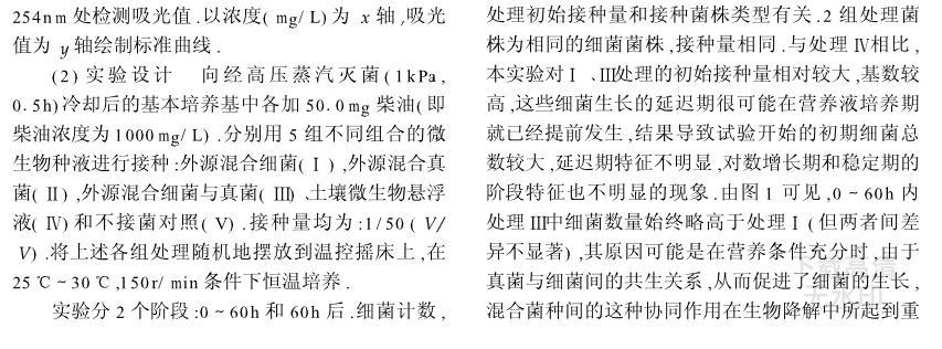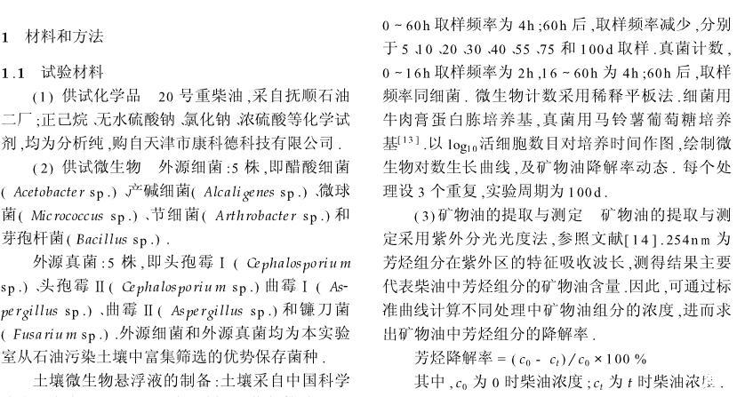 【摘要】:以石油污染土壤中分離的細(xì)菌和真菌為供試微生物,研究不同微生物組合對礦物油芳烴組分降解及降解率與微生物生長間的關(guān)系。將不同組合的微生物接種到加有柴油濃度為10 0 0mg/L的液體培養(yǎng)基中,2 5~30℃經(jīng)搖床連續(xù)培養(yǎng)10 0d.于0~6 0h內(nèi)連續(xù)取樣,進(jìn)行微生物生長動(dòng)態(tài)檢測;于5~10 0d定期取樣,研究微生物生長狀況與礦物油降解率動(dòng)態(tài)變化。