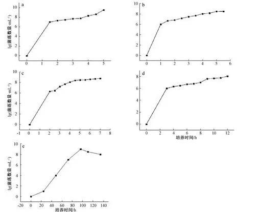 圖1大腸埃希菌(a)、金黃色葡萄球菌(b)、銅綠假單胞菌(c)、白色念珠菌(d)和黑曲霉(e)的生長(zhǎng)曲線