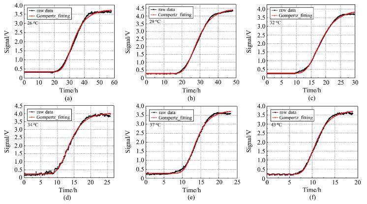 實(shí)驗(yàn)在不同溫度(a)26°C,(b)29°C,(c)32°C,(d)34°C,(e)37°C,(f)43°C下測(cè)量的大腸桿菌生長(zhǎng)曲線(xiàn)及Gompertz模型擬合情況