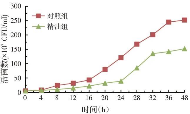 由圖3可知,對照組串珠鐮刀菌在0~16 h處于生長遲緩期,16~36 h處于對數(shù)生長期,36~48 h處于穩(wěn)定期,最大活菌數(shù)為2.5×109CFU/ml。在加入松針精油后,串珠鐮刀菌生長遲緩期延長到24 h,對數(shù)生長期縮短到32 h,并且菌體數(shù)量的峰值較對照組菌體降低39.68%。由以上分析可看出,松針精油對串珠鐮刀菌的生長有著極為明顯的抑制效果,能較長時間的抑制串珠鐮刀菌的生長,縮短了對數(shù)生長期菌種的生長時間,大幅度降低最大活菌數(shù)。