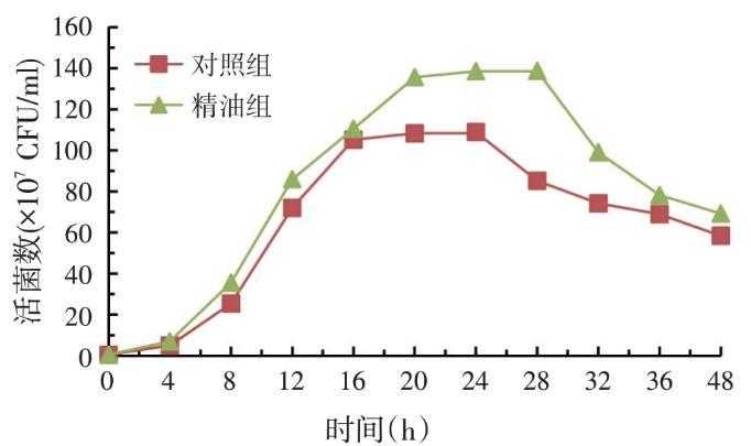 由圖1可知,對照組嗜酸乳桿菌的生長曲線完全符合“S”型生長曲線,有明顯的遲緩期、對數(shù)期、穩(wěn)定期和衰亡期。在0~4 h處于遲緩期,4 h~16 h進入對數(shù)生長期,16~24 h進入穩(wěn)定期,從24 h之后進入衰亡期,最大活菌數(shù)為1.08×109CFU/ml。加入松針精油之后,嗜酸乳桿菌的遲緩期仍為0~4 h,而對數(shù)生長期延長至20 h,并且最大活菌數(shù)較對照組增加27.36%??梢?,松針精油對嗜酸乳桿菌并沒有起到抑制效果,反而起到了一定的促進作用,延長了對數(shù)生長期,導致菌體數(shù)量達到了一個新的峰值,并且延緩了衰亡期的到來。