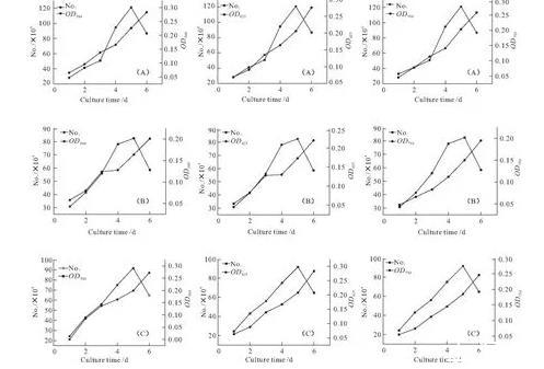 圖1朱氏四爿藻(A)、心形四爿藻(B)、大四爿藻(C)的生長(zhǎng)曲線(根據(jù)幾組特定光密度值繪制)