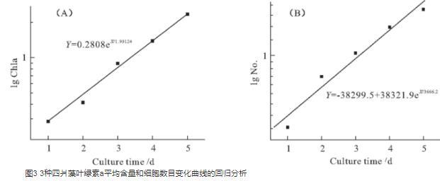采用Origin v6.0作圖,分析生長(zhǎng)曲線的差異,并對(duì)3種四爿藻據(jù)葉綠素a的平均含量繪制的生長(zhǎng)曲線進(jìn)行回歸,并與細(xì)胞計(jì)數(shù)法得到的生長(zhǎng)曲線回歸結(jié)果進(jìn)行比較。