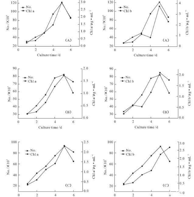 圖2朱氏四爿藻(A)、心形四爿藻(B)、大四爿藻(C)的生長(zhǎng)曲線(根據(jù)葉綠素a、b含量繪制)