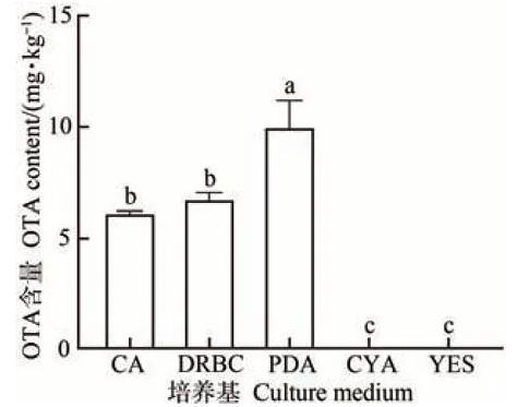 硫色曲霉在CYA和PDA培養(yǎng)基上生長較好,僅次于YES培養(yǎng)基,但在CYA和YES培養(yǎng)基上不產(chǎn)毒,這是因為盡管CYA培養(yǎng)基中所含有的碳源可以滿足硫色曲霉的生長,但其培養(yǎng)基中所含有的硝酸鈉會抑制OTA的產(chǎn)生,所以CYA和PDA培養(yǎng)基可用于觀察硫色曲霉的生長,而PDA培養(yǎng)基可同時用于觀察硫色曲霉的生長和產(chǎn)毒。