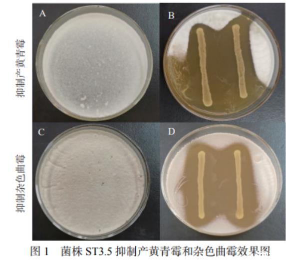 從泡菜中分離獲得34株分離菌株。分別以產(chǎn)黃青霉和雜色曲霉作為測(cè)試菌,通過(guò)瓊脂覆蓋法測(cè)定34株分離菌株對(duì)產(chǎn)黃青霉和雜色曲霉的抑制作用。結(jié)果表明菌株ST3.5的抑制效果最好。由圖1可知,與對(duì)照組相比較,接種的乳酸菌條帶具有顯著的抑制作用,其抑菌圈覆蓋面積超過(guò)50%,表明菌株ST3.5對(duì)產(chǎn)黃青霉和雜色曲霉均具有較強(qiáng)的抑菌效果。