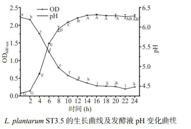 L.plantarum ST3.5的生長(zhǎng)曲線(xiàn)和pH變化曲線(xiàn)如圖2,由圖可見(jiàn),該菌株在測(cè)定時(shí)間內(nèi)OD值先迅速增加后趨于平穩(wěn)。在2 h左右,因?yàn)橛谐渥銧I(yíng)養(yǎng)物質(zhì),所以乳酸菌迅速進(jìn)入對(duì)數(shù)生長(zhǎng)期,開(kāi)始大量繁殖,同時(shí)OD600 nm值增加,在16 h左右,隨著乳酸菌的生長(zhǎng)和繁殖,產(chǎn)生了大量的代謝產(chǎn)物,大量的營(yíng)養(yǎng)物質(zhì)被消耗殆盡,隨后停止了對(duì)數(shù)生長(zhǎng),進(jìn)入了穩(wěn)定期,并且在16~24 h期間OD值均保持穩(wěn)定。由于乳酸菌生長(zhǎng)會(huì)產(chǎn)生酸性物質(zhì),所以L(fǎng).plantarum ST3.5前16 h的pH從6.25迅速下降到4.51,在16~24 h期間乳酸菌停止生長(zhǎng)和繁殖,所以pH無(wú)顯著變化(P>0.05),趨于穩(wěn)定。