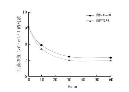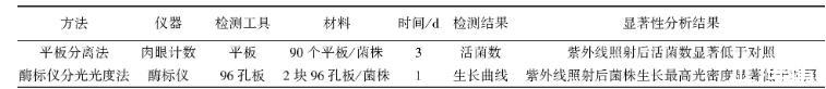 本研究采用傳統(tǒng)平板分離法和酶標儀分光光度法分別檢測了細菌和鏈霉菌對紫外線的耐受性能,并比較分析了兩種方法的優(yōu)缺點。兩種方法均能分析微生物的紫外線耐受水平,但傳統(tǒng)平板分離法是通過統(tǒng)計菌株經(jīng)紫外線照射后的存活量來進行判斷,而酶標儀分光光度法不能獲得菌株的存活量,卻可以根據(jù)其生長曲線分析存活菌株的增殖水平,進而判斷該菌株的紫外線耐受性。兩種方法都能獲得菌株的耐受性,其結(jié)果也存在一定的互補性。