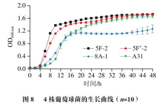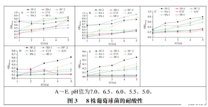 由圖3可得,實(shí)驗(yàn)中8株葡萄球菌更適合在偏中性環(huán)境生長,酸性條件會(huì)在一定程度上影響菌株的生長能力,相同時(shí)間內(nèi)隨著pH值的下降,菌液濃度逐漸下降,菌株進(jìn)入生長對(duì)數(shù)期的時(shí)間逐漸延后。