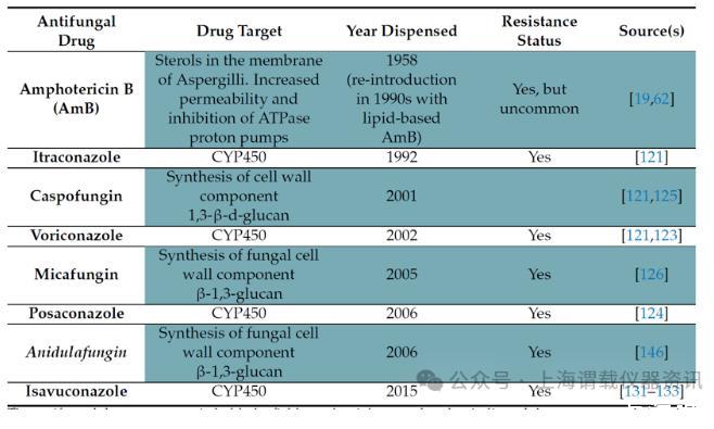 圖3、用于治療曲霉病的常用抗真菌藥物。伊曲康唑和氟康唑?qū)儆诘谝淮蝾愃幬?。第二代唑類包括伏立康唑、泊沙康唑和艾沙康唑。CYP450作為目標意味著麥角甾醇的合成受到影響,這對細胞膜至關(guān)重要。通過抑制CYP450所依賴的14α羊毛甾醇脫甲基酶來實現(xiàn)的。