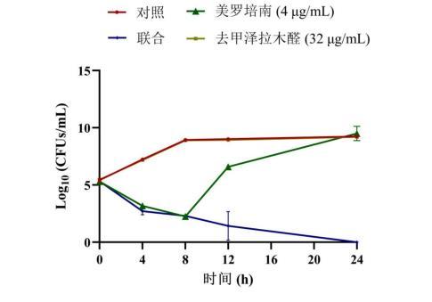 圖為去甲澤拉木醛聯(lián)合美羅培南對NDM-1臨床分離株E.coli ZJ487的殺菌曲線試驗結(jié)果