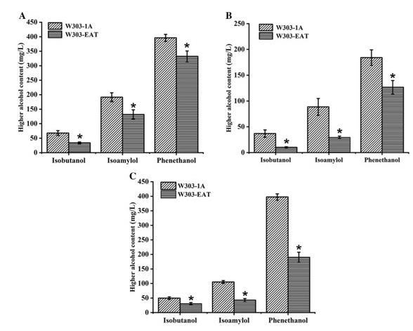 圖4、W303-1A和W303-EAT不同低度酒[玫瑰酒(A)、藍莓酒(B)和黃酒(C)]中較高酒精含量的比較。星號(*)表示不同低度酒的酒精度較高,差異顯著。從圖中看出與W303-1A相比,重組菌株W303-EAT對低發(fā)酵葡萄酒中異丁醇、異戊醇和苯乙醇的含量降低有顯著性差異(P<0.05),表明重組菌株W303-EAT具有具有特殊的還原高級醇的作用,對改善酒的風味具有重要意義。