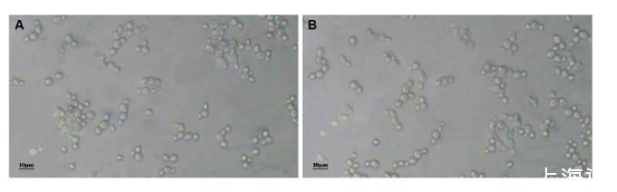 圖2、W303-1A(A)和W303-EAT(B)的細胞顯微形態(tài)。兩株菌株均為卵圓形,呈典型的單細胞形態(tài),無胞間連鎖,細胞大小無明顯差異,充分說明EAT基因的克隆和表達對其細胞形態(tài)無不良影響。