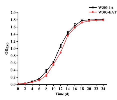 將重組菌株W303-EAT及其親本W303-1A在50 mL YPD培養(yǎng)基中以30°C和160 rpm預培養(yǎng)12 h,然后轉移到含有重組菌株W303-EAT或其親本W303的1 mL YPD培養(yǎng)基中-1A放入100 mL YPD培養(yǎng)基中,在30°C和160 rpm下培養(yǎng)24小時。使用Bioscreen全自動微生物生長曲線分析儀(每2小時測定一次光密度(OD 680)。