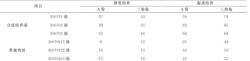 2.3.1.1培養(yǎng)菌數(shù)運用已建立的仔豬副傷寒活疫苗生產(chǎn)用菌株培養(yǎng)參數(shù),制備3批合成培養(yǎng)基(批號分別為200701、200702及200703)與3批普通肉湯培養(yǎng)基(批號分別為20070115、20070122及20070205),各分裝于A型試管(10 mL/管)和500 mL三角瓶(200 mL/瓶)中。按2.2項建立的培養(yǎng)參數(shù),按2%加入種子液,37℃靜置培養(yǎng)24 h和37℃、200 r/min振蕩培養(yǎng)12 h,分別取樣進行活菌計數(shù)。