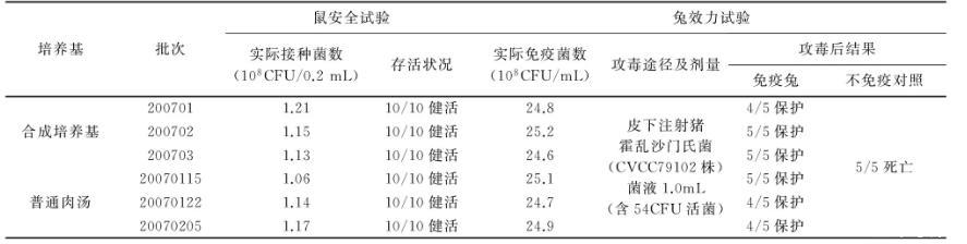 由生長曲線獲得的細菌培養(yǎng)參數(shù),在此參數(shù)下可得出研制的合成培養(yǎng)基批次間相對穩(wěn)定,培養(yǎng)菌數(shù)優(yōu)于普通肉湯。由于牛肉湯難以質(zhì)量標準化,因此3批普通肉湯培養(yǎng)菌數(shù)差異大[3-4]。同時運用合成培養(yǎng)基培養(yǎng)的菌體對小鼠的安全檢驗及對家兔的免疫攻毒結(jié)果與普通肉湯一致,符合《規(guī)程》[3]中“仔豬副傷寒活疫苗制造及檢驗規(guī)程”的要求。另外合成培養(yǎng)基保存28 d,其培養(yǎng)菌數(shù)與當天新配制培養(yǎng)基一致。因此,初步試驗表明,研制的合成培養(yǎng)基質(zhì)量穩(wěn)定,培養(yǎng)菌數(shù)高,而且不改變菌體的安全性及免疫原性,可替代普通肉湯。當然,合成培養(yǎng)基在發(fā)酵生產(chǎn)中的實用性有待進一步研究。