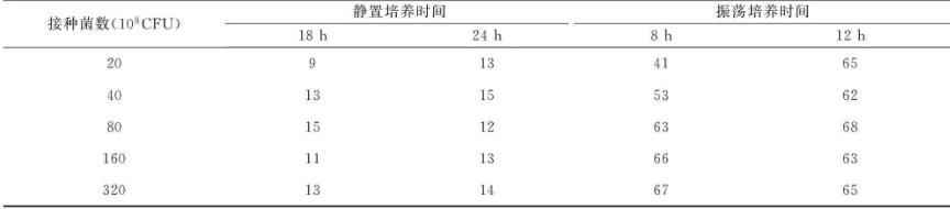 將普通肉湯按200 mL/瓶分裝10瓶500 mL三角瓶,2%接入種子液(每瓶4 mL),接入菌數(shù)分別為20×108、40×108、80×108、160×108、320×108CFU,其中5瓶37℃靜置培養(yǎng)24 h,另5瓶置37℃、200 r/min振蕩培養(yǎng)12 h,期間分別取37℃靜置培養(yǎng)18、24 h,37℃振蕩培養(yǎng)8、12 h樣品各5 mL,按現(xiàn)行《中國獸藥典》[6]方法進行活菌計數(shù)。