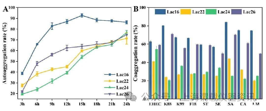 圖1、乳酸菌與人畜共患病原體的自聚集率(A)和共聚集率(B)。乳酸菌菌株的自聚集率隨時間逐漸增加,在24小時時達(dá)到70%以上,并且Lac16表現(xiàn)出比其他菌株更高(p<0.05)的自聚集率(Lac22,Lac24,Lac26)。