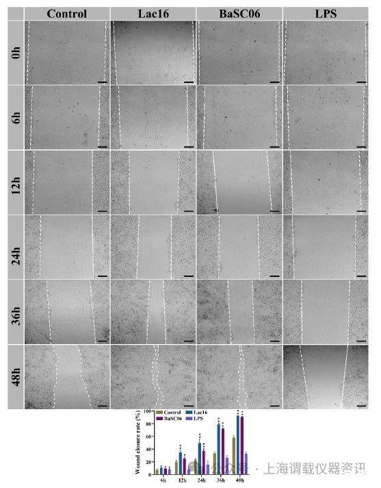 圖4、益生菌促進(jìn)IPEC-J2細(xì)胞的傷口閉合。IPEC-J2細(xì)胞用益生菌(MOI=100)或LPS(40μg/mL)處理不同時間。結(jié)果是三個獨立實驗的平均值±標(biāo)準(zhǔn)偏差。