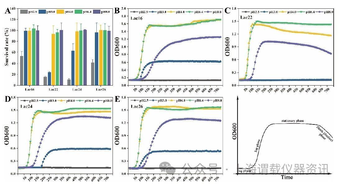 圖2、乳酸菌在不同pH值模擬胃腸液中的存活率(A)和生長曲線(B-E,OD600值)。四種乳酸菌菌株(Lac16、Lac22、Lac24、Lac26)對pH 8.0的模擬腸液表現(xiàn)出良好的耐受性。Lac16和Lac26對模擬胃液表現(xiàn)出更好的耐受性,在pH 3.0和pH 4.0下的存活率幾乎為100%,而在pH 2.5下為40-55%(圖2A)。Lac24在pH 3.0下的存活率為62.28%。四種乳酸菌菌株可以在pH 4.0和pH 8.0下生長良好,在固定相的吸光度值為0.9–1.8(圖2 B–E)。Lac16、Lac24和Lac26可以在pH 3.0下生長,固定相吸光度值為0.3–0.6(圖2是)。與pH 4.0和pH 6.4相比,這四種乳酸菌菌株的對數(shù)生長期和靜止期在pH 3.0和pH 8.0時延遲。