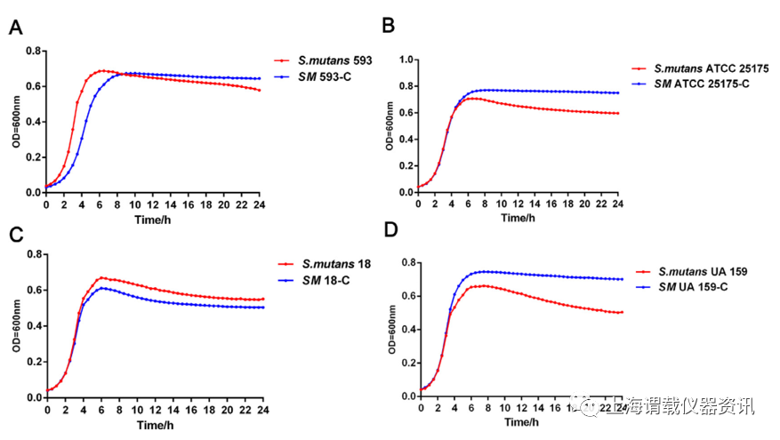 圖3、在pH 7.0的BHI培養(yǎng)基中生長的四種變形鏈球菌菌株和SM-Cs的生長曲線。變形鏈球菌593(A)、變形鏈球菌ATCC 25175(B)、變形鏈球菌18(C)和變形鏈球菌UA 159(D)的OD600(y軸),每隔30分鐘檢測一次。