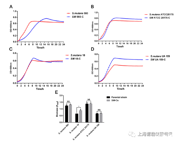 圖4、四種變形鏈球菌菌株和SM-Cs的致齲性。(AD)在pH 5.5的BHI培養(yǎng)基中生長的四種變形鏈球菌菌株和SM-Cs的生長曲線。變形鏈球菌593(A)、變形鏈球菌ATCC 25175(B)、變形鏈球菌18(C)和變形鏈球菌UA 159(D)和SM-Cs(AD)的OD 600(y軸)分別為每隔30分鐘檢測一次。(E)四個變形鏈球菌菌株及其CHX抗性菌株(x軸)的生物膜生物量(y軸)。