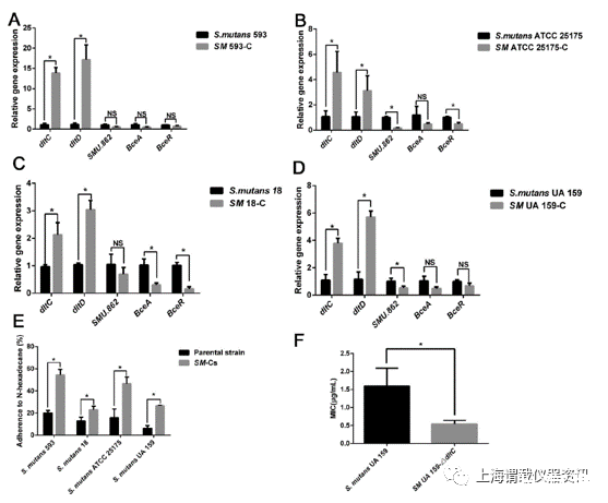 圖5、變形鏈球菌抗CHX的可能機制。(AD)dltC、dltD、SMU.862、BceA和BceR基因在四個變形鏈球菌菌株及其CHX抗性菌株中的表達(dá)水平(y軸)。(E)四種變形鏈球菌菌株及其CHX抗性菌株的細(xì)胞表面疏水性。通過細(xì)胞對N-十六烷的粘附率(y軸)評估細(xì)胞表面疏水性。(F)CHX對變形鏈球菌野生型和衍生物的MIC。