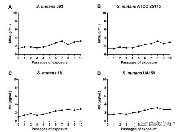 圖1、選擇敏感性降低的突變體。變形鏈球菌593(A)、變形鏈球菌ATCC 25175(B)、變形鏈球菌18(C)和變形鏈球菌UA 159(D)暴露于CHX 10次。CHX對四種變形鏈球菌菌株的MIC值(y軸)在第0至10代(x軸)后重復(fù)測定。數(shù)據(jù)顯示為平均MIC值±SD。