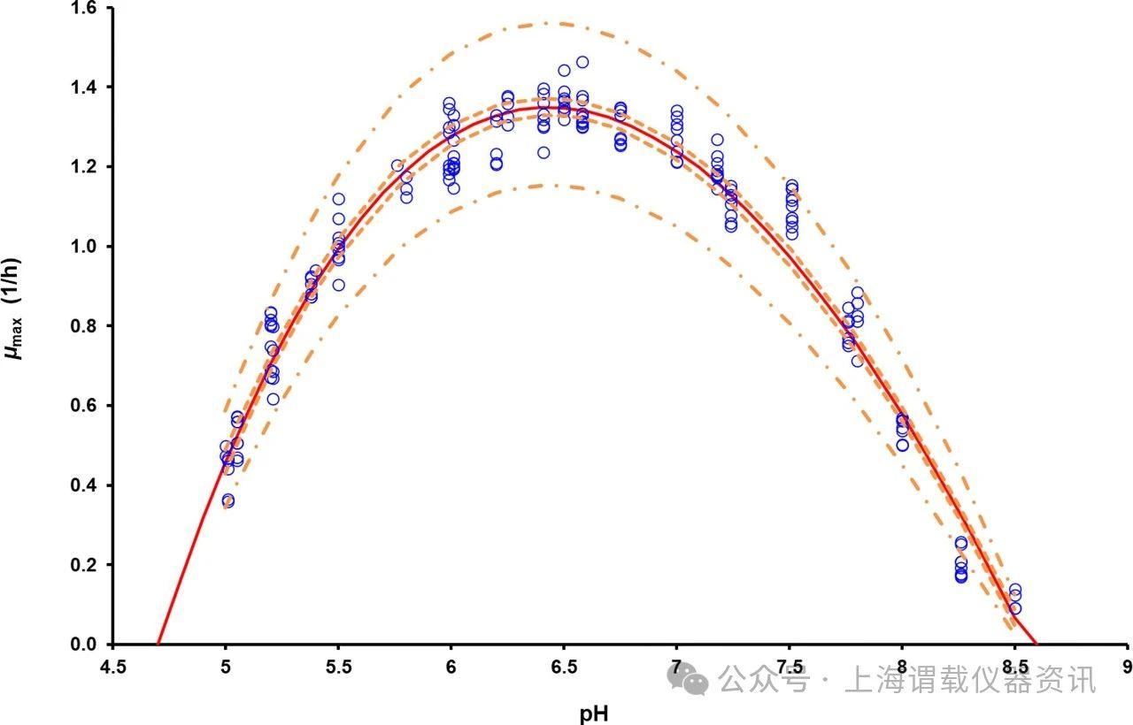 圖1、溫度對(duì)腦心浸液肉湯中的凝結(jié)芽孢桿菌DSM 1的最大比生長(zhǎng)速率的影響,數(shù)據(jù)被擬合到帶有拐點(diǎn)的基數(shù)模型。