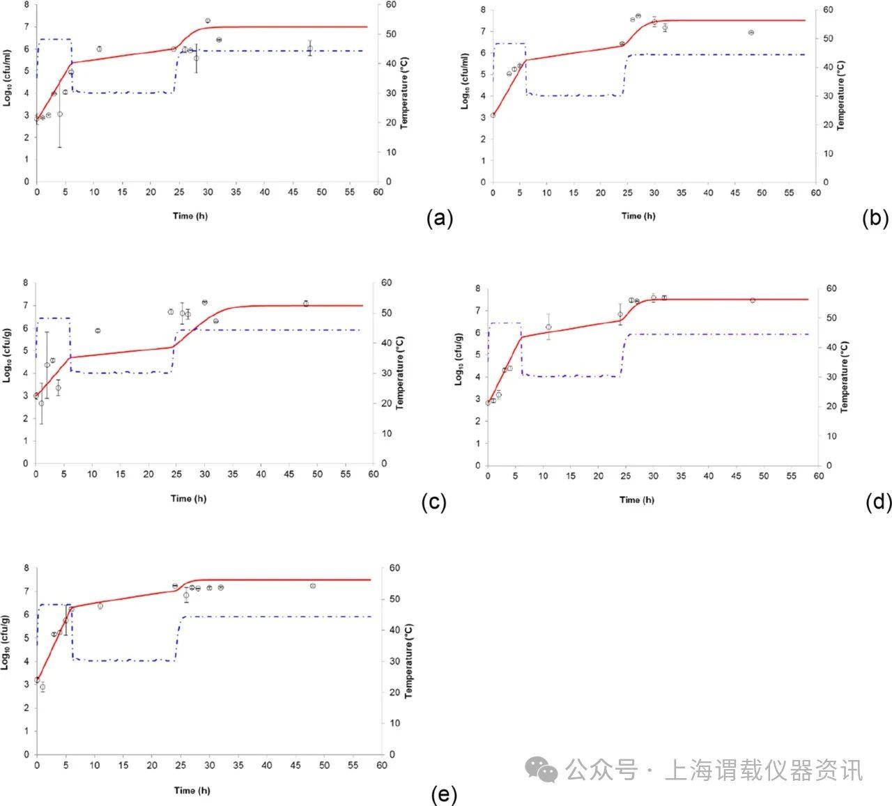 圖5、觀察到的比較(○)和預(yù)測(cè)增長(zhǎng)(-)的凝結(jié)芽孢桿菌DSM 1的凝結(jié)芽孢桿菌DSM 1在淡奶(a)、燕麥和杏仁飲料(b)、酸奶甜點(diǎn)(c)、蘑菇片罐頭(d)和牛肉和蔬菜泥(e)中,在非等溫條件下(25°C/24小時(shí)–30°C/24小時(shí)–50°C/10小時(shí))。藍(lán)色虛線(---)表示溫度變化。
