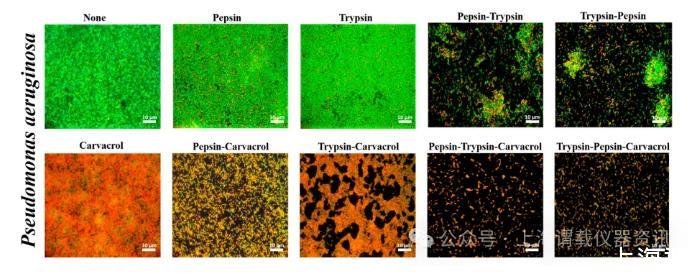 圖5、用胃蛋白酶、胰蛋白酶處理后銅綠假單胞菌生物膜的落射熒光顯微圖像,或以1 mg mL?1的濃度連續(xù)處理兩者各1小時(shí),或隨后用?MIC的香芹酚處理(2.5 mg mL?1)持續(xù)1分鐘。在用SYTO9(活細(xì)菌的綠色熒光)和碘化丙啶(死細(xì)菌的紅色熒光)染色后觀察細(xì)胞。對照代表用胰蛋白胨鹽肉湯處理的生物膜。