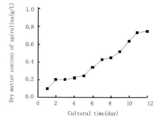 圖3是用日光燈照射培養(yǎng)螺旋藻的生長曲線,隨著養(yǎng)殖時間增加,螺旋藻干物質(zhì)含量呈上升趨勢;在2 d~5 d生長速率較慢,為緩慢增長期;在5 d~11 d生長速率較快,呈對數(shù)增長,為快速增長期;在11 d達(dá)到了生長的最大濃度,干物質(zhì)含量為0.742 g/L,是初始含量的7倍。