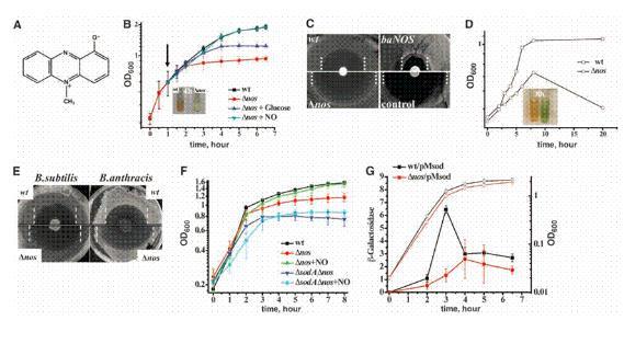 圖2、NO調(diào)節(jié)綠膿桿菌耐藥性機(jī)制研究。A)吩嗪(PYO)的化學(xué)結(jié)構(gòu);B)枯草桿菌在不同條件下(氧化亞氮、加入PYO、葡萄糖等不同環(huán)境中)的生長情況分析;C)bNOS酶表達(dá)增強(qiáng)細(xì)菌對PYO的耐藥性效果實(shí)驗(yàn);D)炭疽桿菌在含有一樣化氮和PYO抗生素一起培養(yǎng)的生長曲線情況分析。E)內(nèi)源性一氧化氮保護(hù)枯草桿菌和綠膿桿菌中的炭疽桿菌對抗生素的耐藥性研究;F)缺失SodA(超氧化歧化酶)枯草桿菌和正??莶輻U菌Z在含有一氧化氮和不含有一氧化氮的情況下對PYO抗生素的耐藥性研究。從圖中可以看出,缺失SodA(超氧化歧化酶)枯草桿菌對PYO敏感,溶液被抗生素殺死,而缺失nos酶基因的枯草桿菌對PYO抗生素沒有那樣敏感。G)bNOS控制Sod A蛋白的表達(dá),采用了OD值測試細(xì)菌的生長曲線,其中左邊的曲線表示的是乳糖甘酶的活性。