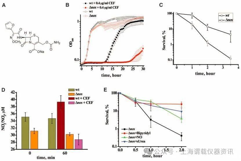 圖3、bNOS酶保護(hù)細(xì)菌耐頭孢呋辛的機(jī)制研究。圖A表示的是頭孢呋辛的化學(xué)結(jié)構(gòu);B表示的是金黃色葡萄球菌在抗生素頭孢呋辛(CEF)存在下的生長情況分析。從圖中可以看出,缺失nos基因的金黃色葡萄球菌對抗生素CEF敏感,其生長繁容易受到抗生素的抑制,而正常的金黃色葡萄球菌則對CEF表現(xiàn)出一定的耐藥性;C表示的是不含有bNOS酶枯草桿菌菌株和正常的枯草桿菌6051對頭孢呋辛環(huán)境中的存活情況分析。D表示的是細(xì)菌bNOS酶活性受抗生素刺激的影響,從圖中可以看出正常細(xì)胞加入抗生素后,會增加細(xì)菌內(nèi)的亞硝酸鹽的生成,這是因?yàn)榧?xì)菌內(nèi)bNOS酶與抗生素反應(yīng)后生成了更多的亞硝酸鹽副產(chǎn)物。E)NO對缺少nos基因枯草桿菌在二聯(lián)吡啶以及尿素中的存活率的影響。從圖中可以看出,缺失nos基因的枯草桿菌中加入二聯(lián)吡啶或尿素或一氧化氮后,該菌的存活率會增加。