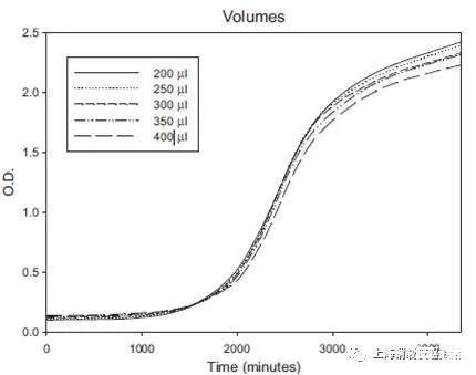 圖3、在Bioscreen C分析儀的100孔的微孔板加載不同體積的菌種后得到的平均生長(zhǎng)曲線(10條個(gè)體曲線平均值)。接種量為金黃色葡萄球菌105/ml,培養(yǎng)溫度為25℃。