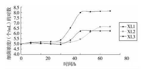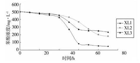 圖1是3株菌在降解培養(yǎng)基中生長過程中菌體數(shù)量的變化曲線。從曲線中可以看出菌株XL1生長狀況最好,也就是說XL1菌株更適應在含苯酚的環(huán)境中生長繁殖。