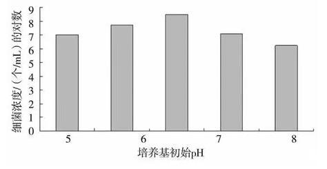 LB培養(yǎng)基調整為不同的初始pH值,菌株XL1在其中培養(yǎng)28h后,分別測定菌體數(shù)量。測定結果見圖4。