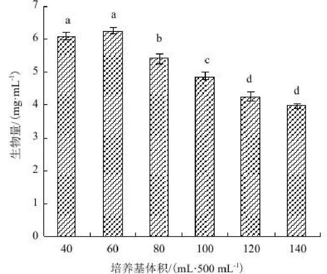 2.7.3裝液量Act0988菌株在不同裝液量的三角瓶?jī)?nèi)培養(yǎng)96 h的生物量(圖10)顯示,裝液量為40 mL和60 mL處理的生長(zhǎng)最佳,生物量分別為6.1 mg/mL和6.3 mg/mL,兩者間差異不顯著,且都顯著高于其他裝液量處理的生物量;裝量為120 mL和140 mL菌株的生長(zhǎng)最差,生物量?jī)H為4.3 mg/mL和4.0 mg/mL。結(jié)果表明,菌株生長(zhǎng)對(duì)溶氧的需求量較大。