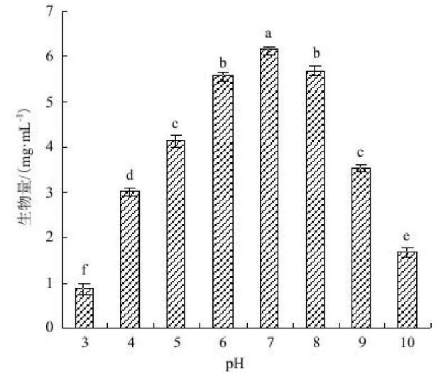 2.7.2 pH不同初始pH培養(yǎng)Act0988菌株的生物量(圖9)顯示,菌株經(jīng)pH7處理的生長(zhǎng)最好,生物量為6.2 mg/mL,與其他處理間的差異顯著(P>0.05)。其次,pH=6、8處理發(fā)酵液生物量分別為5.6 mg/mL和5.7 mg/mL。其余5個(gè)pH培養(yǎng)基發(fā)酵液的生物量顯著低于前3個(gè)pH處理的發(fā)酵液的生物量。結(jié)果表明,菌株生長(zhǎng)適宜中性及弱酸、弱堿條件。