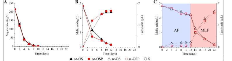 圖1、發(fā)酵動力學實驗。(A)AF期間的糖消耗:co-OS和co-OSP分別等于se-OS和se-OSP。(B)co-OS、co-OSP同步發(fā)酵和(C)se-OS、se-OSP順序發(fā)酵中的蘋果酸(實線)和乳酸(虛線)濃度。