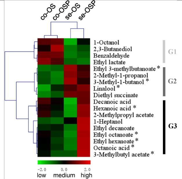 圖4、從MLF中提取的梅洛葡萄酒揮發(fā)物的熱圖和層次聚類分析。*香氣活性揮發(fā)性物質(濃度超過香氣閾值的揮發(fā)性物質)。