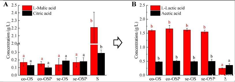 圖3、梅洛葡萄酒中與O.oeni代謝相關的主要有機酸的濃度。(A)蘋果酸和檸檬酸。(B)乳酸和乙酸。